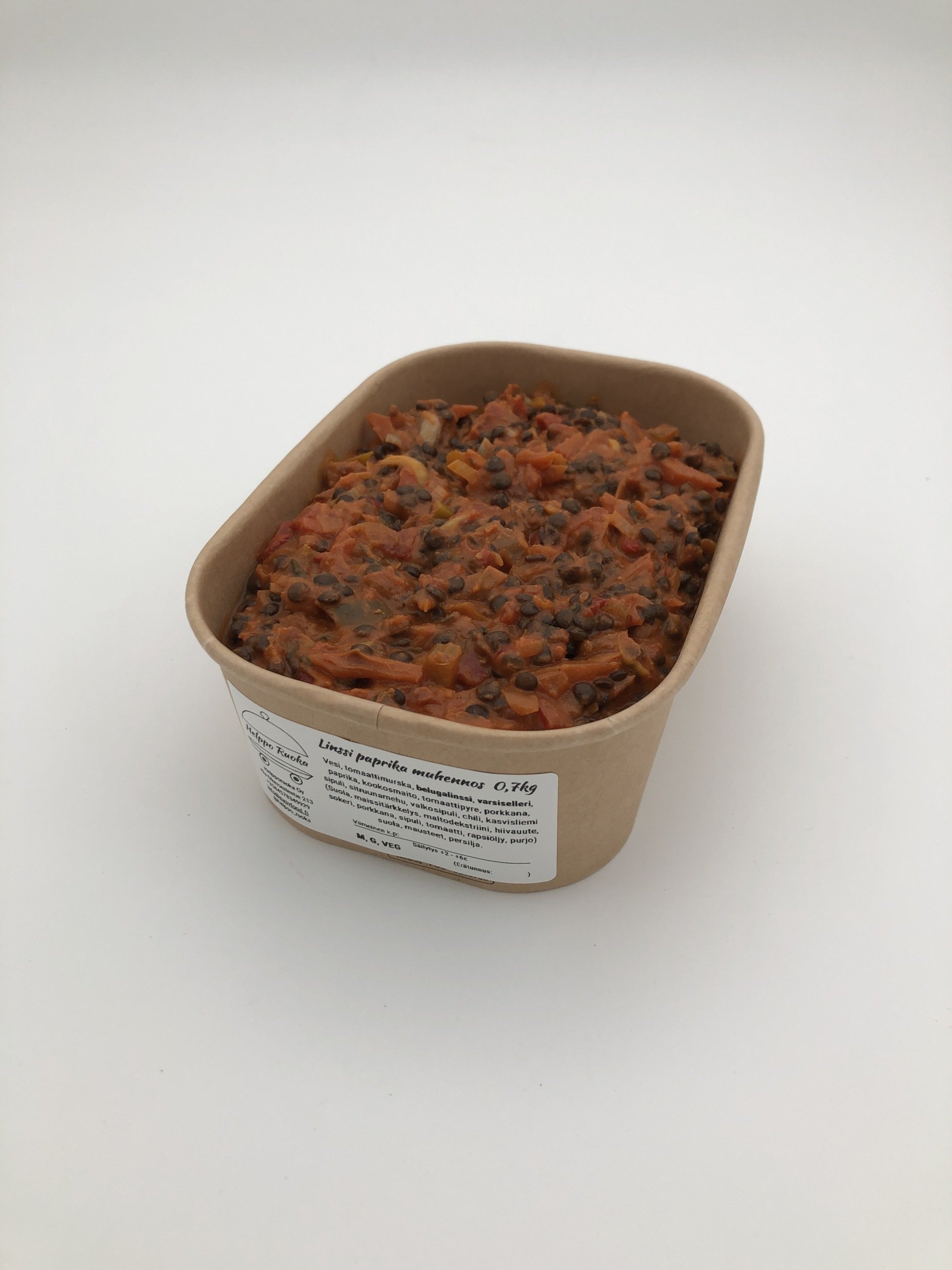 Belugalinssi, tomaattimurska, varsiselleri, paprika, kookosmaito, vesi, porkkana, sipuli, tomaattipyre, valkosipuli, sitruunamehu, chili, inkivääri, kasvisliemi (Suola, maissitärkkelys, maltodekstriini, hiivauute, sokeri, porkkana, sipuli, tomaatti, rapsiöljy, purjo) suola, persilja.
